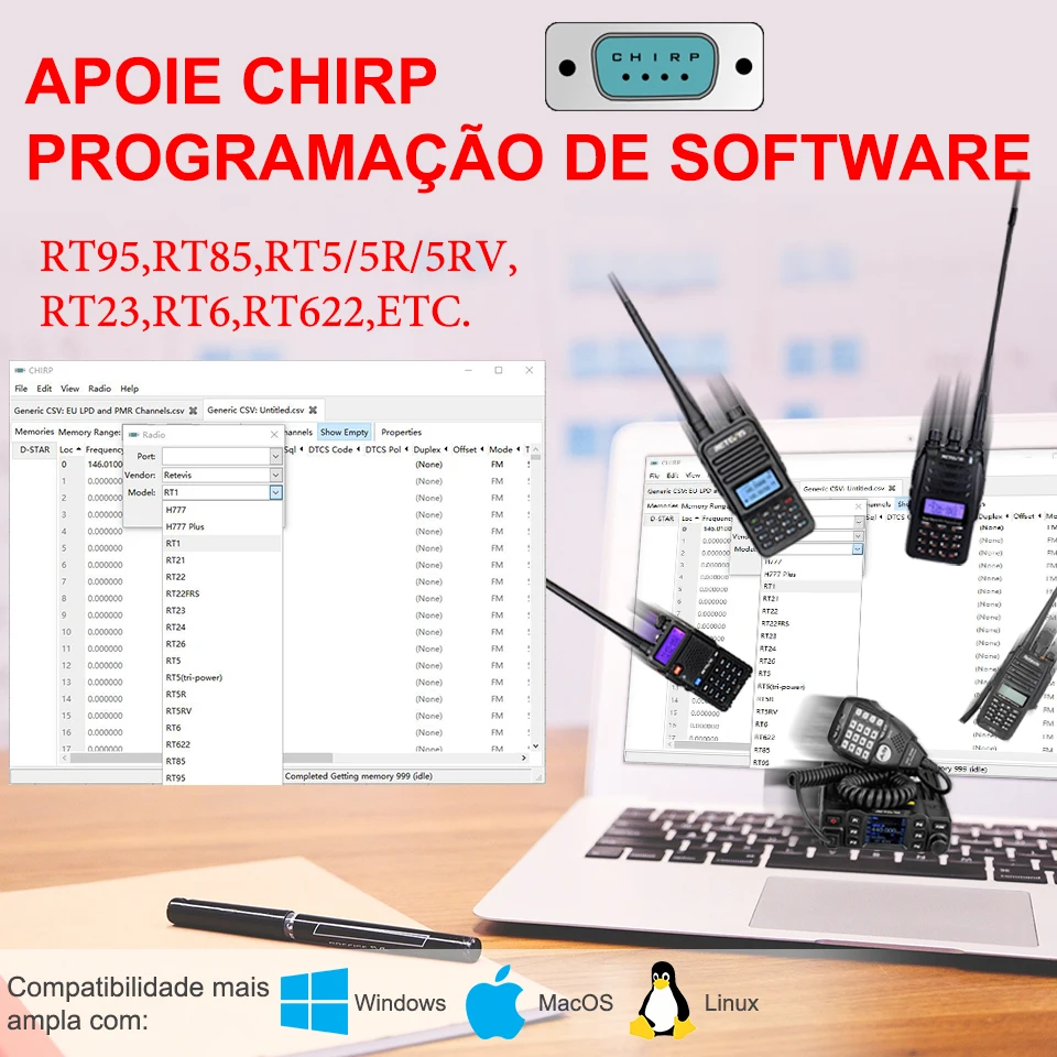 MODE1 = 430-440, 144-148 MODE2 = 400-490, 136-174 MODE3 = 430-440, 144-146 Quando você escolher o modo 2, então você pode usar a freqüência completa. 136-174 mhz e 400-490mhz 4) desligue o dispositivo, depois ligue novamente. Será a nova faixa de frequência que você setted. Pergunta 2:Rt95 pode usar o software chirp para programar? R: sim, ele suporta. Você pode baixar a partir daqui:Https://chirp.danplanet.com/projects/chirp/wiki/Download | |||||||||||||||||||||||||||||||||||||||||||||||||||||||||||||||||||||||||||||||||||||||||||||||||||||||||||||||||