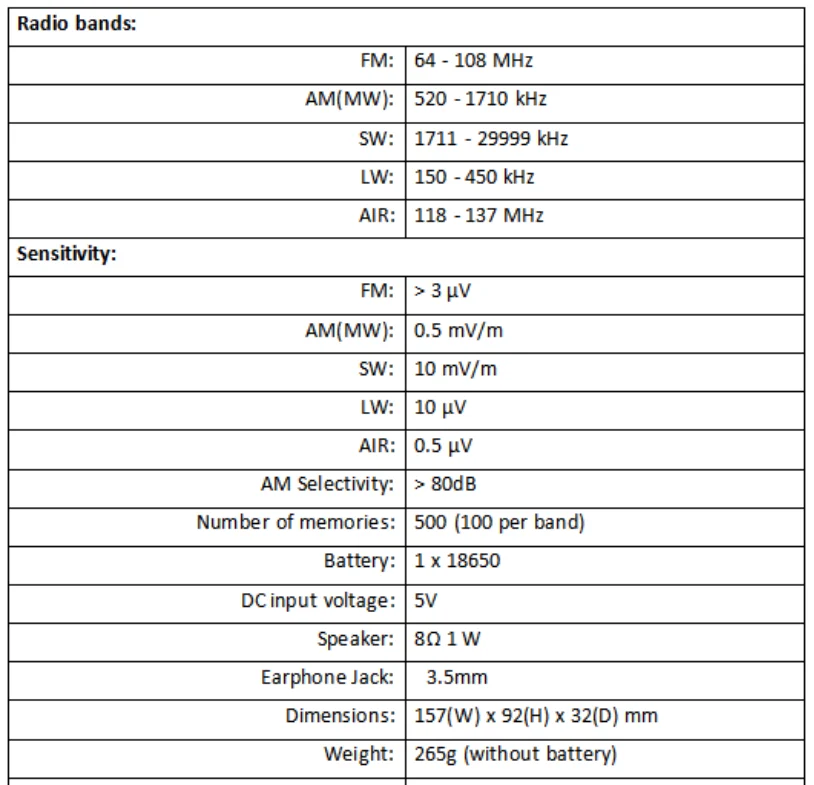 Radio Band: AM / FM / SW / LW / AIR / SSB